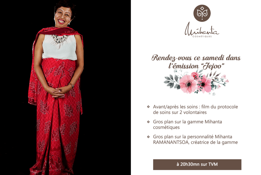 Mihanta RAMANANTSOA vous donne rendez-vous ce samedi dans l’émission « Jejoo » sur la chaîne nationale TVM, pour parler des gammes Mihanta Cosmétiques et faire une démonstration du protocole de soins. Ce sera également une autre occasion d’en découvrir un peu plus sur la personnalité de la créatrice.
